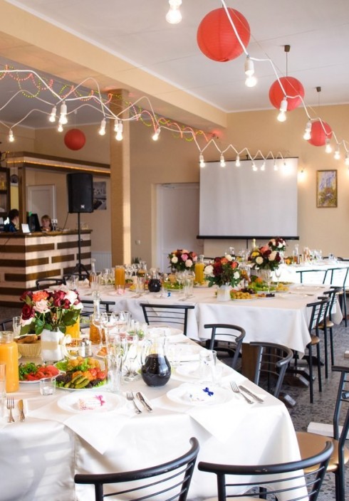 Аренда зала, банкетное обслуживание и приготовление блюд, свадебная арка, гирлянды, цветомузыка, звуковое оборудование, скатерти и чехлы на стулья, вазы, летняя терраса вместимостью до 80 человек, трансфер, проживание, банный комплекс, бассейн.
