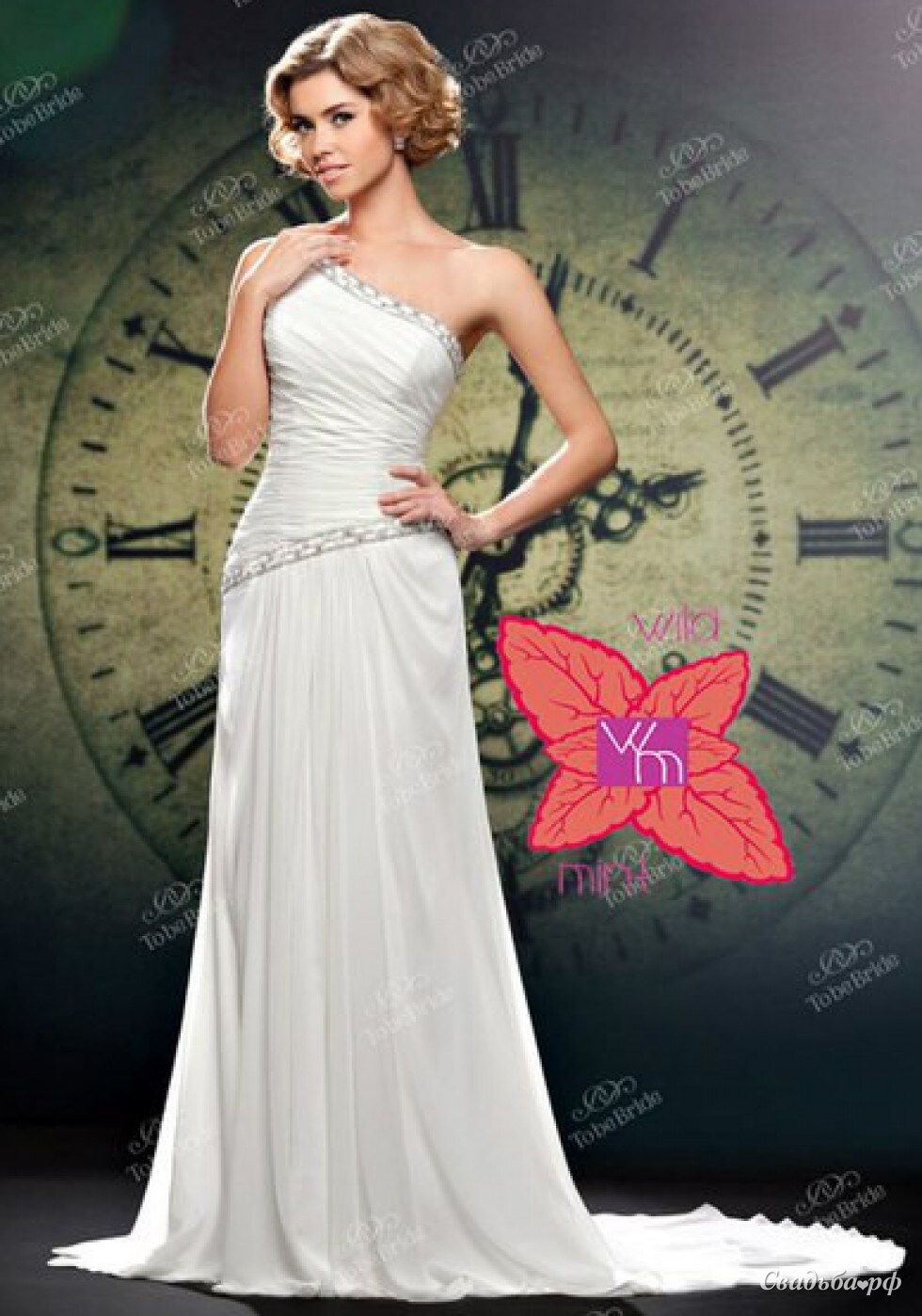 Простотой и изящностью линий это платье напоминает греческую тогу. Драпировки на лифе подчеркивают изгибы тела, на юбке – образуют красивые ниспадающие складки. Шлейф и блестящий декор по асимметричным линиям плеча и заниженной талии делают образ по-настоящему возвышенным.